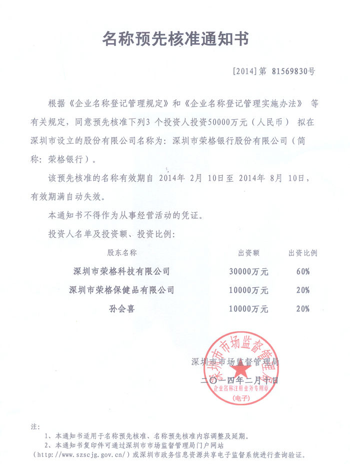 〖本站讯〗借改革开放之新风,由荣格科技集团作为发起人成立荣格银行取得了新的进展。近日,深圳市市场监督管理局出具《名称预先核准通知书》([2014]第81569830号),预先核准荣格拟设立的民营银行名称为“深圳市荣格银行股份有限公司”(简称:荣格银行),允许荣格设立自己的银行,这标志着荣格科技集团布局金融业已迈出关键的一步。