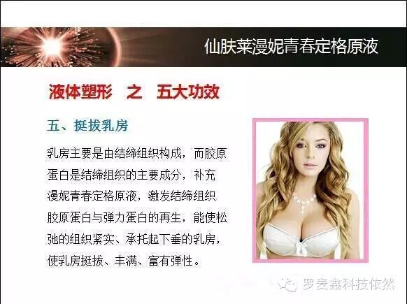 5、挺拔乳房:乳房主要是由结缔组织构成,而胶原蛋白是结缔组织的主要成分,补充仙肤莱漫妮青春定格原液,激发结缔组织胶原蛋白与弹力蛋白的再生,能使松弛的组织紧实、承托起下垂的乳房,使乳房挺拔、丰满、富有弹性。