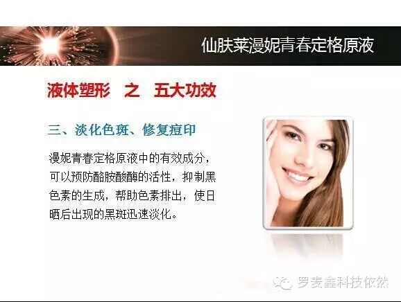 3、淡化色斑、修复痘印:仙肤莱漫妮青春定格原液中的有效成分,可以预防酪胺酸酶的活性,抑制黑色素的生成,帮助色素排出,使日晒后出现的黑斑迅速淡化,并且可以修复受损组织,解除痘印烦恼。