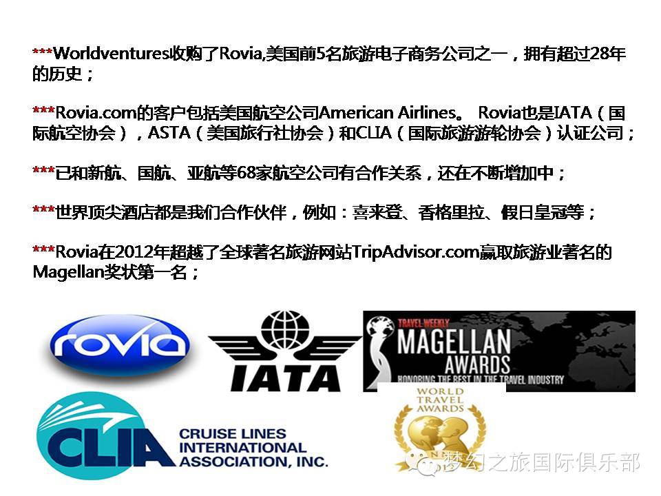 ★Worldventures收购了Rovia,美国前5名旅游电子商务公司之一,拥有超过28年的历史。Rovia.com的客户包括美国航空公司American Airlines。Rovia也是IATA