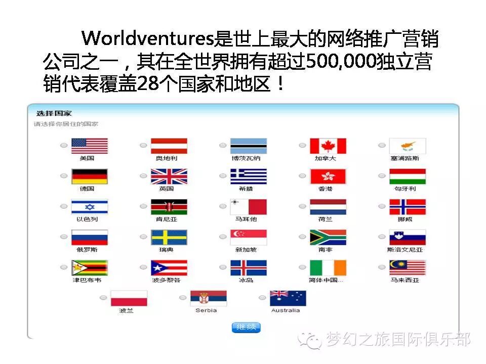 worldventures是世上最大的直销公司之一同时也是一家社交媒体营销公司,其在全世界拥有超过400,000独立营销代表覆盖23个国家和地区(包括美国)