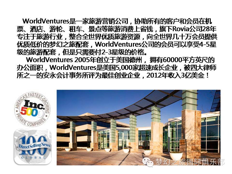 WorldVentures2005年创立于美国Dallas,Texas,拥有38000平方英尺的办公面积,WorldVentures是美国5,000家超速成长企业,2012年世界100强直销公司第75名,全球成长最快排名第六,2012年收入3亿美金。