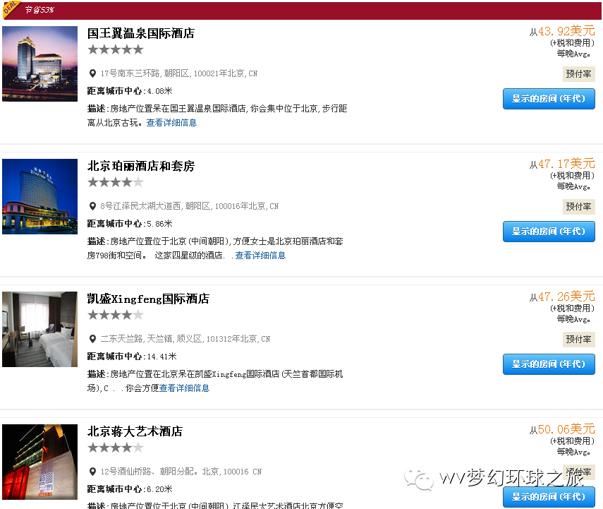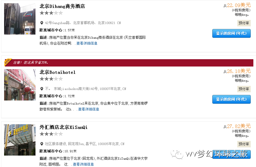 上面是部分北京三星级酒店的价格,看到没100多块钱就可以入住北京三星级酒店啦,说简单一点北京的7天连锁或者如家宾馆都要180呢,作为梦幻之旅的会员,幸福吧!