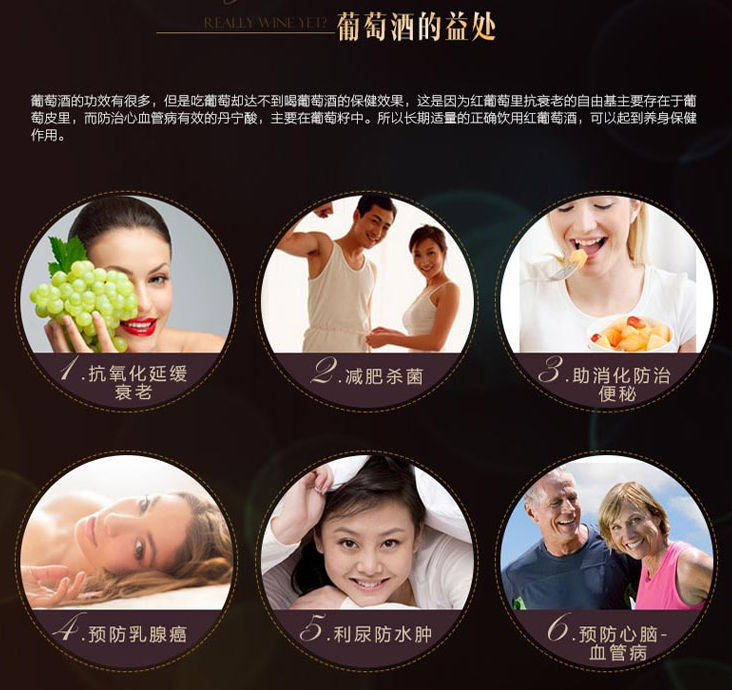 红葡萄里抗衰老的自由基主要存在于葡萄皮里,而防治心血管病的单宁酸主要存在于葡萄籽中。长期适量饮用葡萄酒,可以起到养身保健的作用。