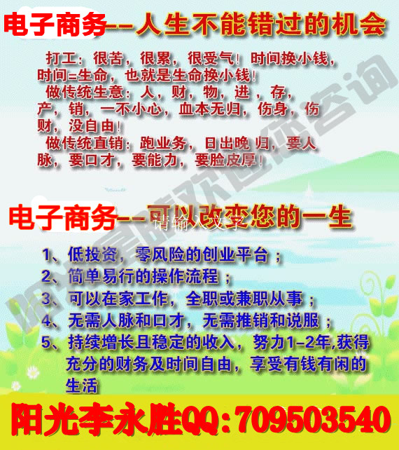 财富第六波隆力奇E化直销,直销结合了电子商务的复合式的营销,网上宣传,网上培训,网上寻找合作伙伴。一个以消费创富的平民创富舞台,一台电脑,一根网线,一杯咖啡,在家轻松创业赚钱,实