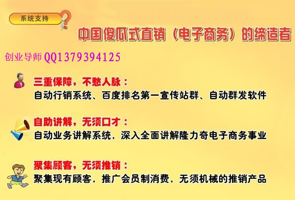 选择成功注定拥有成功!天雨大,不润无根之草,商道宽,只渡有心之人!E化直销创业导师昸澐曾任某公司主管,开过服装店,家政公司,工艺品工作室,有丰富的创业经历和人生阅历,现在是互联网资深全职创业导师,商学院金牌讲师,定制营销经理,全天16小时在线,对网络宣传推广,博客空间制作,团队带动等有丰富经验,能够全方位帮助您快速获得成功!诚邀各界朋友考察,加盟E化直销先机事业★★腾讯号1379394125★★TEL15678714081