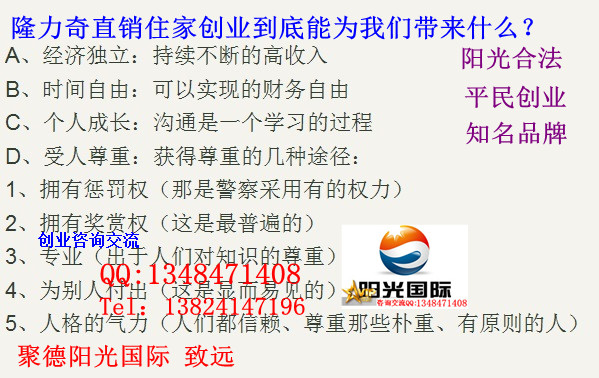1.借助网络平台、运用直销工具、千元少量投资;居家白手创业、实现财富自由、辉煌人生梦想。