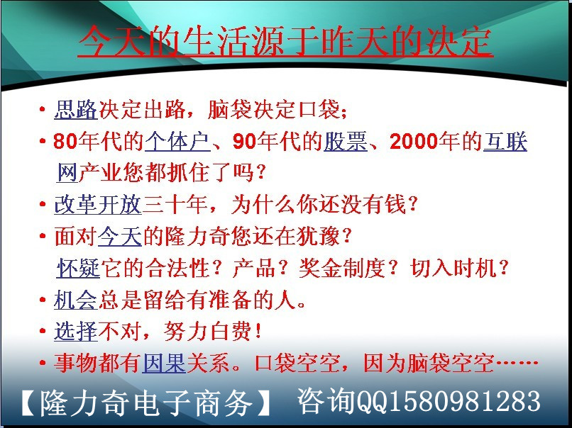 隆力奇电子商务:不需像传统直销企业那样到处找熟人朋友、求亲戚家人,更不需要去四处开会听课、不分节假日的推销和进货、发货,也根本没有任何消费压力。太爽了!你只要跟着老师学会宣传和沟通,同时依靠公司“傻瓜式宣传”等工具,即可轻松操作,及早赚钱就是!