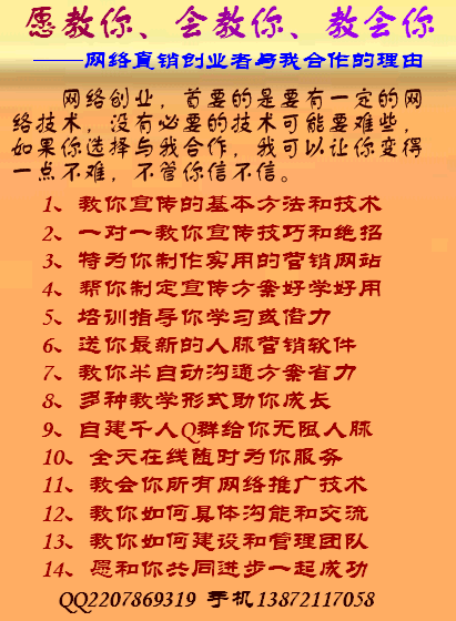 我们将会手把手的教你如何轻松在家创业!让你走上了一台电脑,一根网线,陪着家人,足不出户,轻松住家创业做遍 全球生意之路!也会使你体会到一年打拼月薪过万,两年努力周薪过万,三年奋斗日薪过万.中国第一品牌公司网商教练,愿协助你彻底改变命运。一台电脑,一根网线,穿着睡衣,品着咖啡,轻松在家做遍全球生意。