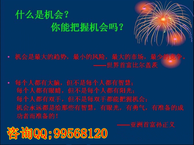 人与人最大的区别就是思想和观念!人之所以不成功,大多是由于观念,观念决定未来!借助实力雄厚的企业,借助成功的网络,与品牌价值百亿的企业在一起,与网商系统在一起,选择了成功你就可能成功!朋友,如果你也是想成为改变自己人生的人,请挥动你的鼠标,加我咨询了解吧,咨询不需要花费您一分钱,只需要花一点点你看电影玩游戏的时间!