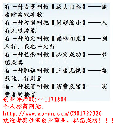 所以说,不光是我的人生经历与电子商务创业能找到一个很好的切合点,应该是99%的人都可以在这个平台上找到很好的切合点,都能够运用这个平台、这种模式来实现自己的人生梦想。这是个能够让成功的人更加成功,让优秀的人走向卓越的事业,也是一个穷人创业、富人投资的事业,更是一个让穷人打一个翻身仗,让有志之士能够改变家族命运,去勇敢地博一代而富三代的事业!直销事业真的能够浓缩我们人生的奋斗历程,让我们经过短短二到三年的时间打拼后,获得我们一辈子甚至几代人才能创造的财富!同时,我们自己的个人能力、修养和素质每天也都在全方位的逐渐的提升,在这个行业打拼,我们不但获得了健康、美丽,实现自己的财务自由,还能结交到全国各地志同道合的朋友,更是能给自己一个非常圆满的人生!