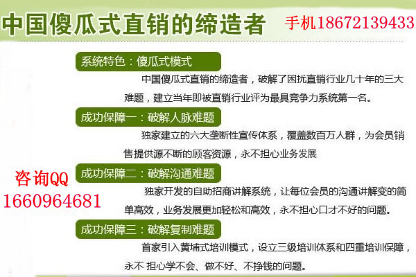 通过这种“傻瓜式直销”的运作模式,使我们直销人员,不再需要人脉、不再需要讲解,甚至不再需要推销,任何人都可以借助系统所特有的“傻瓜式行销系统”快速发展、快速创收。