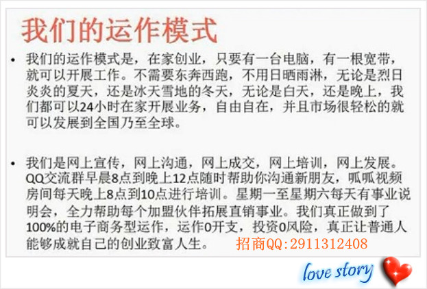 我们都知道,互联网已经普及到了千家万户,无论是个人求职、找项目,还是购物、玩游戏,大多已经习惯通过互联网来搜索信息。而我国每天同时在线的人数就高达4亿,这就为从事直销提供了充足的人脉。网商系统为每一位会员提供一个价值上万的宣传网站、提供系列宣传视频和宣传素材,提供先进的自动宣传工具、网络嗅觉系统、以及覆盖互联网的庞大站群,那些在互联网找工作、找项目的人就会主动向会员咨询合作,从而为每一位会员解决了直销事业中的最大难题——缺乏人脉。更为神奇的是,每位会员其实是不需要亲自为咨询者讲解的,我们系统有专门的自助式业务讲解系统,这个系统会自动的帮助会员讲解,比人工讲解更细致、更专业、更透彻。这不但解决了会员不会讲的问题,同时也更能让咨询者树立信心:原来从事直销是很简单的一件事情