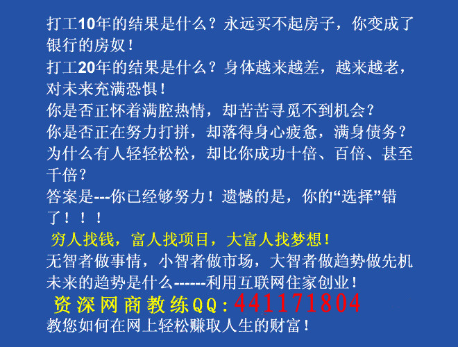 无论您是任何行业、任何背景、任何学历都没关系,这是一个适合大多数人创业的=项目,更重要的是可以让我成为自由支配财富的人,成为事业的成功者!中国现在有⑤亿网民,互联网是一个巨大的市场,互联网大致分为三类人群--网民、网友、网商。,网民是在网上查资料看新闻的网民的特点是利用网络去"查看"。 网友是在网上交朋友网友的特点是利用网络去"交流" 。 网商是在网上做生意网商的特点是利用网络去"交易。 我们是不是应该改变一下自己的身份呢? 很多人是在工作中聊天,我们是在聊天中工作,这样的模式你喜欢吗?只要愿意把平时娱乐的时间挤出来花在网络创业上,你就可以得到意向不到的收获,甚至改变一生的命运!