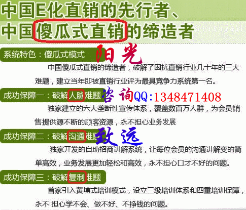 “傻瓜式直销”的运作模式-不要人脉、不要沟通、不要推销也能做直销从事直销,我们都知道,关键是人脉、讲解、销售,这让许许多多缺乏人脉、没有口才、不好意思推销的从业者退缩,并最终放弃了。电子商务E化直销,完全突破了地面传统直销的人脉,沟通和推销三大难题。我们系统首家推出的“傻瓜式直销”模式,犹如一声惊雷,震动了整个直销行业。通过这种“傻瓜式直销”的运作模式,使我们直销人员,不再需要人脉、不再需要讲解,甚至不再需要推销,任何人都可以借助系统所特有的“傻瓜式行销系统”快速发展、快速创收。这让许许多多在直销行业打拼多年的人不可思议:不要人脉、不要沟通、不要推销也能做直销?是的!我们真正把一台电脑,足不出户,穿着睡衣就可以把生意做向全球变成现实!并且专职、****都可以的。资深创业导师真诚与您交流,真诚与您成为朋友创业导师:致远简介2008年从事传统地面直销。2009年工作于珠海某大型外资企业。2010年经自身努力上进,晋升为工程部测试技术员。2012年深圳某台资企业,系统测试工程部任职技术支持。2013年结缘网络电子商务事业,全职运作电子商务事业。致远,互联网电子商务定制营销经理▁▂▃★扣扣【1348471408】★▃▃▂▁★致远老师★扣扣:【1348471408】江西全职★芯漪老师★扣扣:【1801519919】浙江全职★天燕老师★扣扣:【1662652465】重庆全职★恩能老师★扣扣:【2840429241】浙江全职★晓东老师★扣扣:【857862244】河南全职★栗波老师★扣扣:【779848311】河南全职致远老师诚邀您的咨询、加盟与您携手打造美好未来!