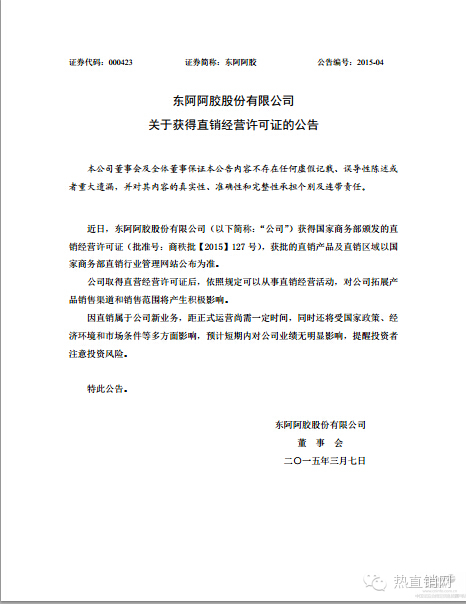 热直销网快讯:2015年3月7日,东阿阿胶发布公告称公司获得国家商务部颁发的直销经营许可证,获批的直销产品及直销区域以国家商务部直销行业管理网站公布为准。