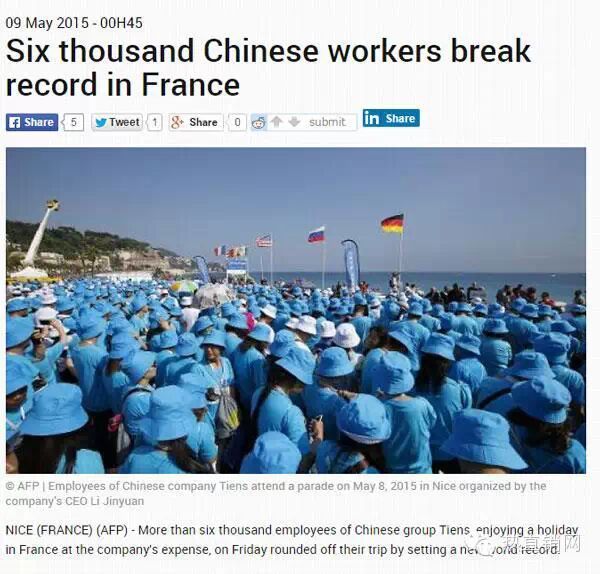 5月6日至9日,来自天津的保健品直销公司天狮集团,在为庆祝公司成立20周年,带着约6500名员工在法国进行了豪华四日游,包括法国《巴黎人报》、英国《卫报》和路透社在内的欧洲主流媒体关注了此事。