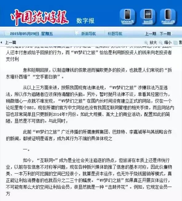 证据有三:第一,“WV梦幻之旅”声称与中国康辉旅行社有限公司开展了全面合作,刘思敏特地与董事长李继烈、总裁董如平进行核实,他们均否认此事,并对“WV梦幻之旅”假借康辉名义行骗表示愤慨。第二,“WV梦幻之旅”在宣传资料中也提到中国商务部门还没有批准,之后有可能取得执照。所以,不管“WV梦幻之旅”是不是一场骗局,在中国没有直销执照就是非法的。第三,旅游是特许经营业务,是国务院授权国家旅游局进行管理的,旅行社业务和导游业务都必须取得旅行社经营许可证。很明显,“WV梦幻之旅”并没有获得许可证。