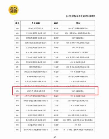当前,民营企业已成为实施创新驱动发展战略、推动经济高质量发展的重要力量。本次发布的榜单数据显示,2025年民营企业发明专利500家的入围门槛已提升至187件,上榜企业共拥有国内有效发明专利高达59.81万件,户均达到1196件,充分展现了民营经济蓬勃的创新活力。尤为引人注目的是,在竞争激烈、技术门槛高的医药制造领域,全国仅有29家企业入围,好医生集团的入选,无疑是对企业长期坚持科技创新战略、构建强大知识产权体系所取得成果的权威认可。