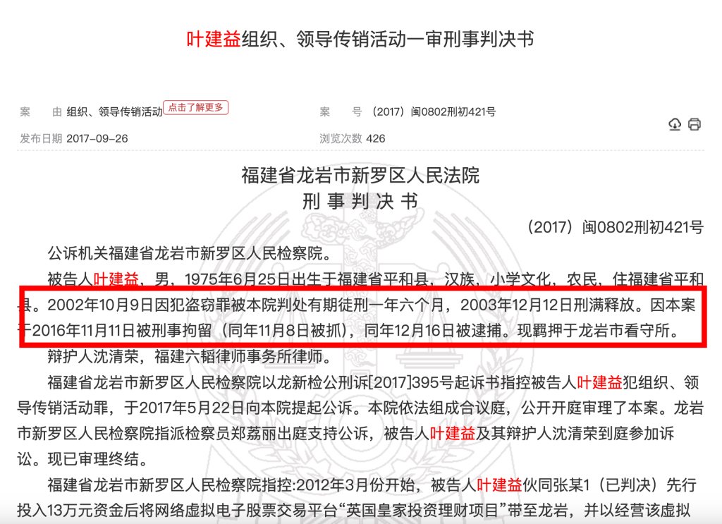 澎湃新闻根据中国裁判文书网检索发现,福建省龙岩市新罗区人民法院于2017年9月公开的一份刑事判决书显示,叶建益1975年出生,小学文化,2002年因盗窃罪获刑一年六个月,于2003年12月释放;2016年又因组织、领导传销活动罪被判处有期徒刑二年,涉案60余人、涉案金额130余万元。