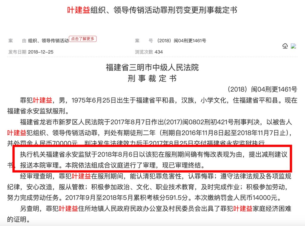 2018年12月,中国裁判文书网另披露过一份《叶建益组织、领导传销活动罪刑罚变更刑事裁定书》,福建省三明市中级人民法院公开的一份刑事裁定书显示,执行机关福建省永安监狱于2018年8月6日以该犯在服刑期间确有悔改表现为由,提出减刑建议书,报送本院审理。本院认为,罪犯叶建益在服刑期间确有悔改表现,符合减刑条件。裁定:对罪犯叶建益减去有期徒刑二个月,刑期自2016年11月8日起至2018年9月7日止。