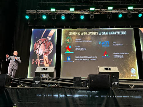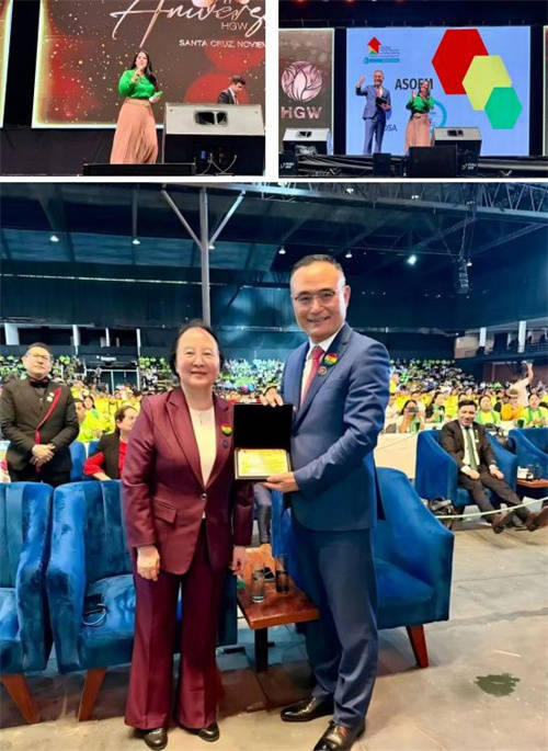 大会伊始,玻利维亚直销协会(ASOEM)执行董事Milka Ortiz B.女士亲临致辞,并代表协会向玻利维亚HGW颁发荣誉证书。她高度肯定了HGW五年来对玻利维亚直销行业发展所付出的努力与取得的商业成就,表彰了HGW五周年的商业成功与对卓越的追求,并感谢其团队为国民经济中发挥主导作用的直销行业所做出的贡献。这一官方背书,是对HGW市场地位的强力认证——目前,玻利维亚分公司已在协会注册直销企业中业绩排名第四,展现出卓越的增长潜力。