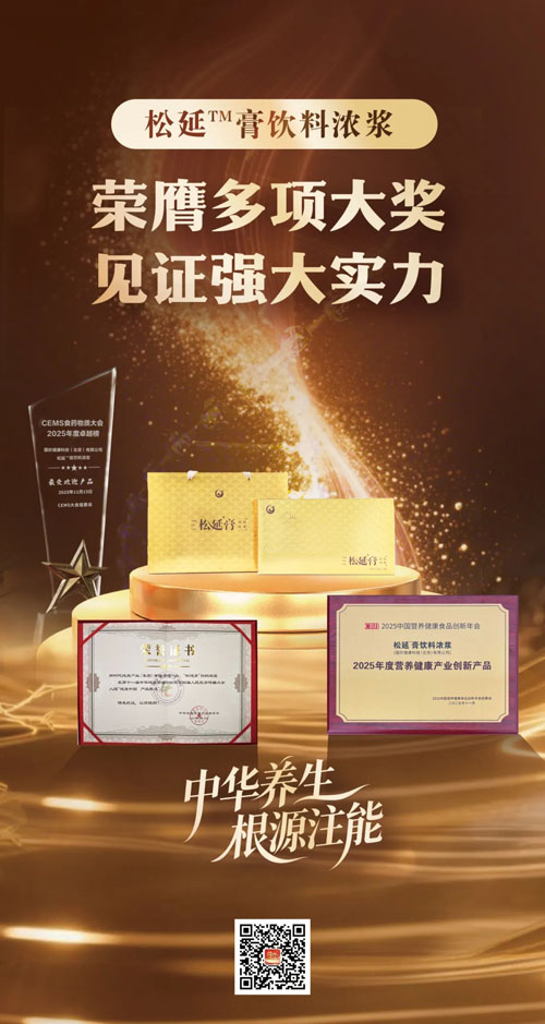如果说“最受欢迎产品奖”是市场的肯定,那么“年度创新产品奖”则是行业对其技术实力的加冕。在2025中国营养健康食品创新年会上,松延TM膏饮料浓浆因其突破性创新实力,荣膺“2025年度营养健康产业创新产品”奖。评审委员会高度认可其在配方、工艺及包装等方面的全面创新。