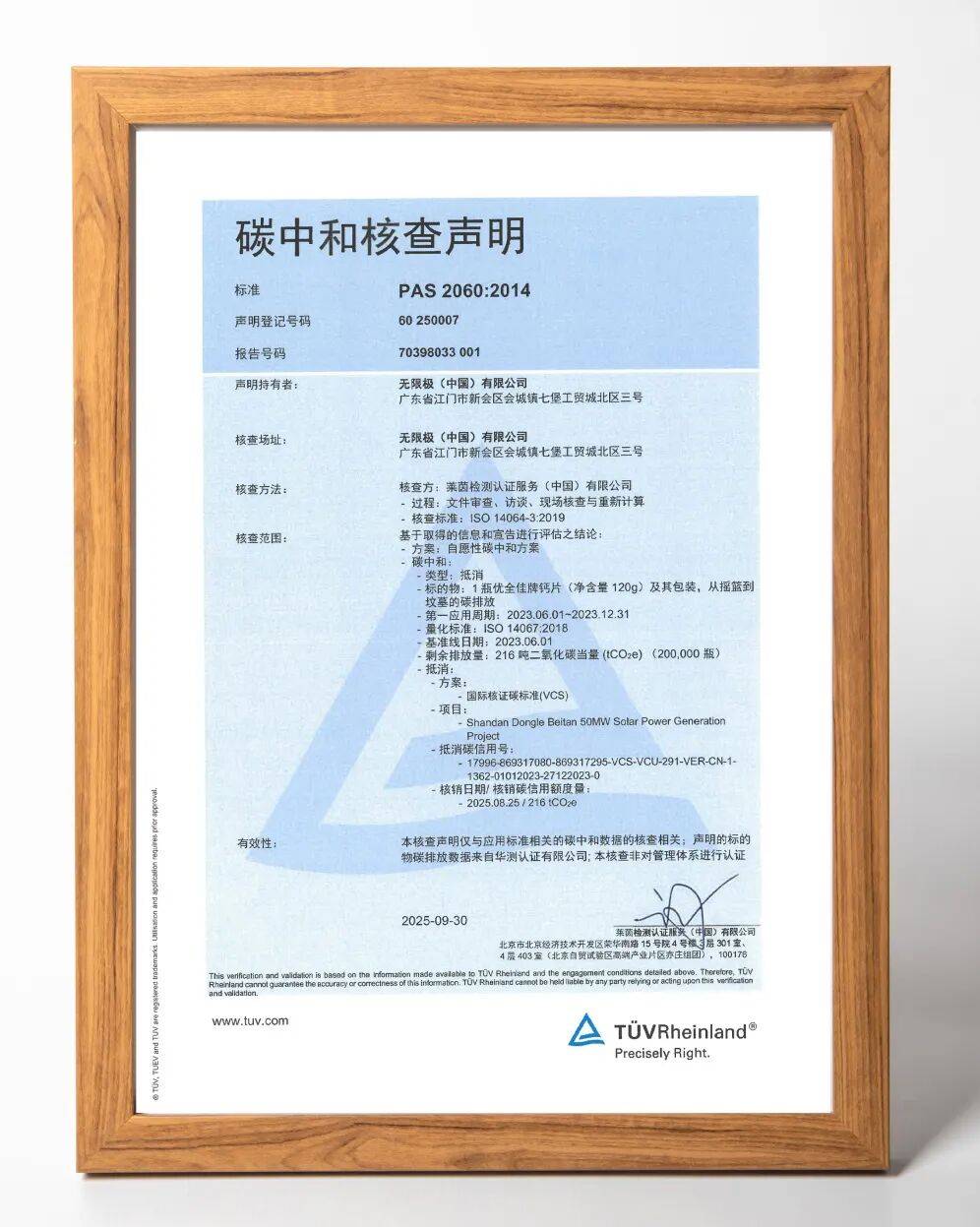 近日,国际独立第三方检测、检验和认证机构TÜV莱茵大中华区为无限极(中国)有限公司旗下健康产品“优全佳牌钙片”颁发了PAS2060碳中和核查声明。这标志着无限极在绿色低碳制造方面取得里程碑式突破,为中国健康产业低碳发展注入新动力。