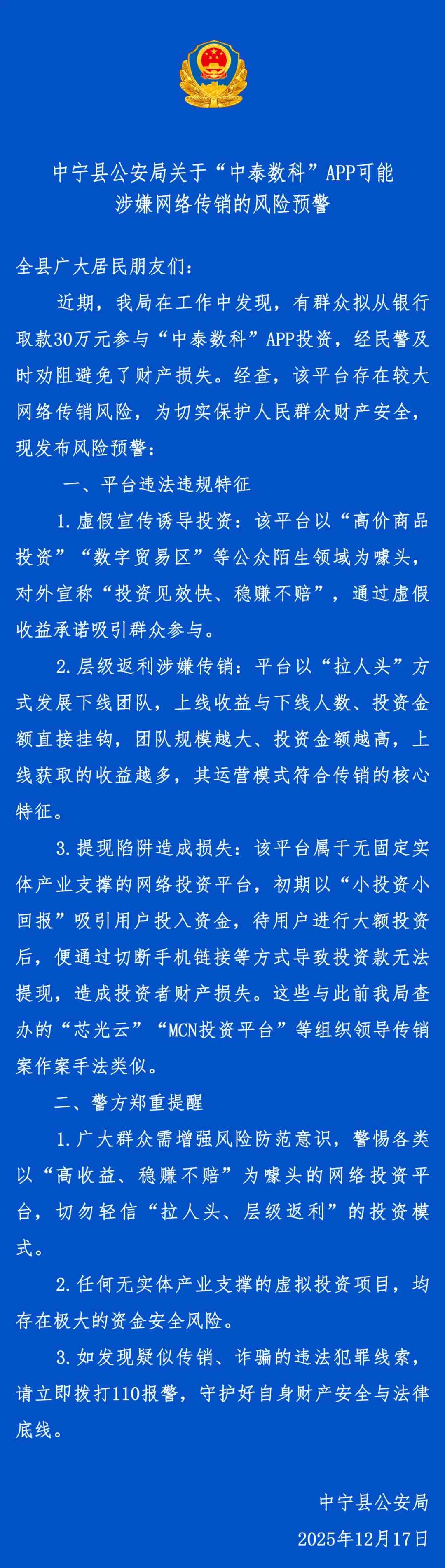 中宁县公安局关于“中泰数科”APP可能涉嫌网络传销的风险预警