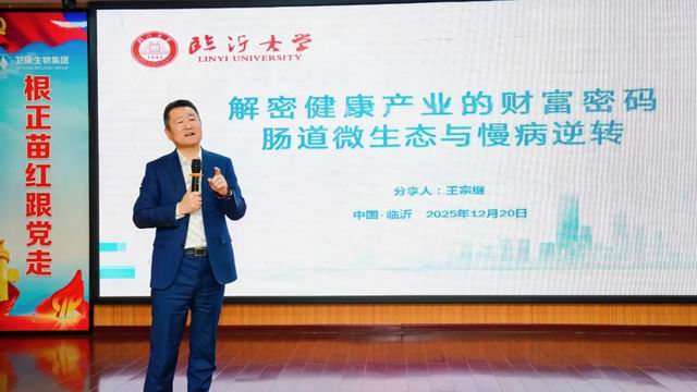 作为东道主,临沂大学教授、再生医学创新研究院院长、卫康生物集团董事长王宗继以《解密健康产业的财富密码:肠道微生态与慢病逆转》为题,为校友们带来一场思想盛宴。