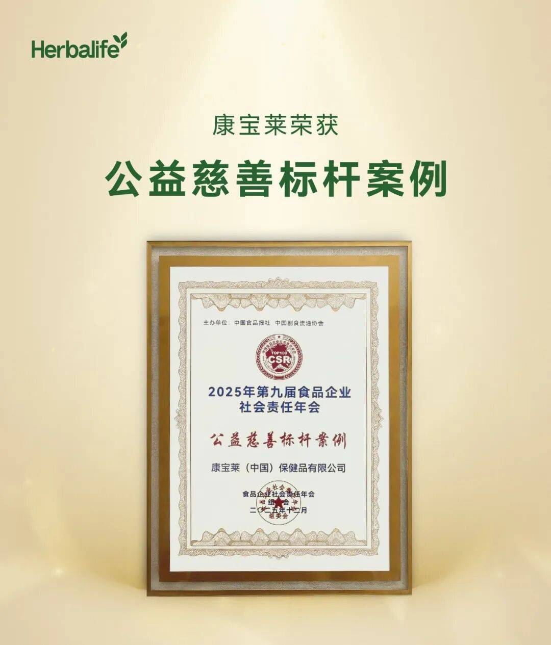 近日,由中国食品报社、中国副食流通协会主办的“第九届中国食品企业社会责任年会”在北京召开。会议发布社会责任优秀案例榜单,康宝莱凭借在食品安全、消费者权益保护、产品质量、科技创新、公益慈善及责任传播等方面的综合表现,荣获“公益慈善标杆案例”奖项。
