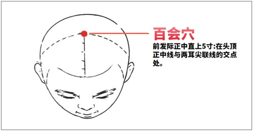 百会穴位于前发际正中直上5寸,在头顶正中线与两耳尖联线的交点处。百会为督脉之要穴,是诸阳集会之处,与各脏腑经络相通,故有调整阴阳整体治疗之用。按摩百会穴对于神经性头痛、失眠、健忘、目眩、冠心病、高血压、低血压、慢性鼻炎、反复呼吸道感染等症,均有一定的保健作用。