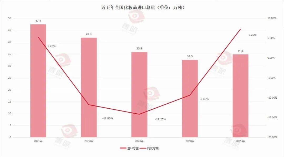 从海关进口数据方面来看,2025年,累计进口“美容化妆品及洗护用品”总量为34.81万吨,同比增长7.2%;累计进口金额则为161.82亿美元(约合人民币1127亿元),同比下降了0.9%。