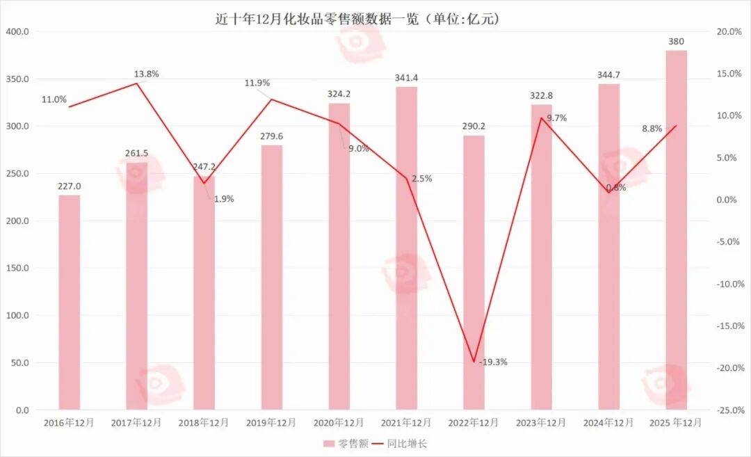 不过,2025年12月,化妆品零售额能录得高个位数的同比增长,也与上一年同期的绝对值不高有关。据国家统计局数据显示,2024年12月,化妆品零售额为344.7亿元,同比仅微增0.8%。