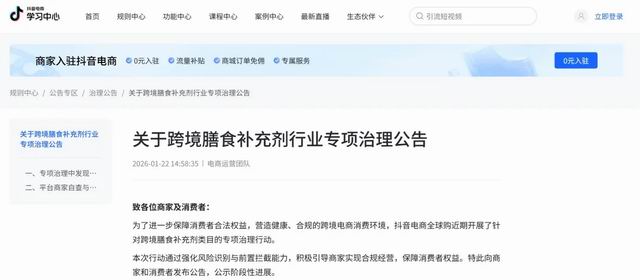 1月22日,抖音发布《关于跨境膳食补充剂行业专项治理公告》。对于专项行动治理涉及二十多个商家或商品,均已在监管部门的指导下依法依规处理。