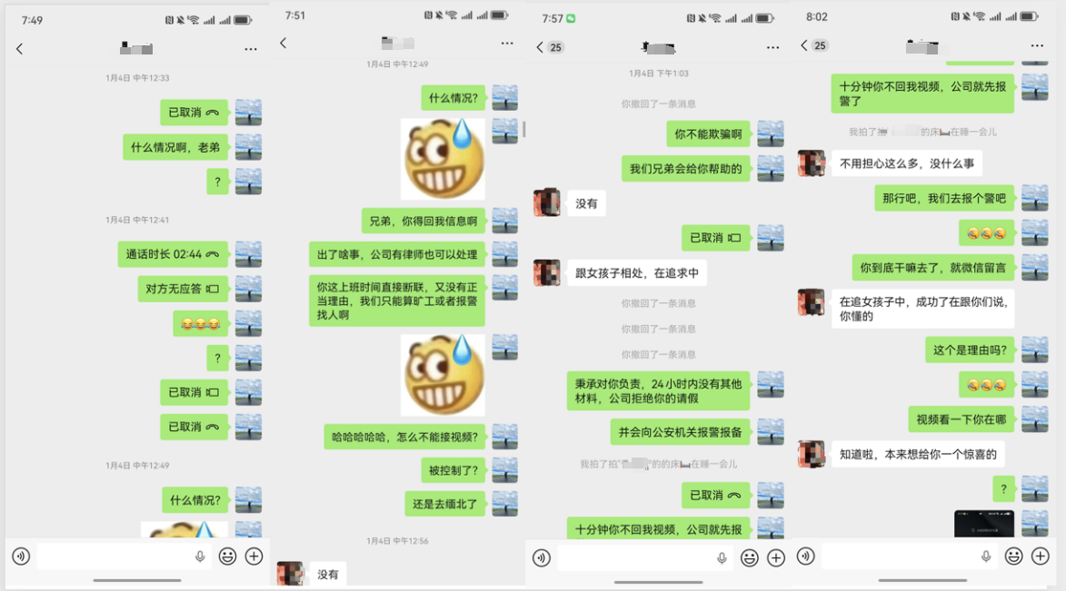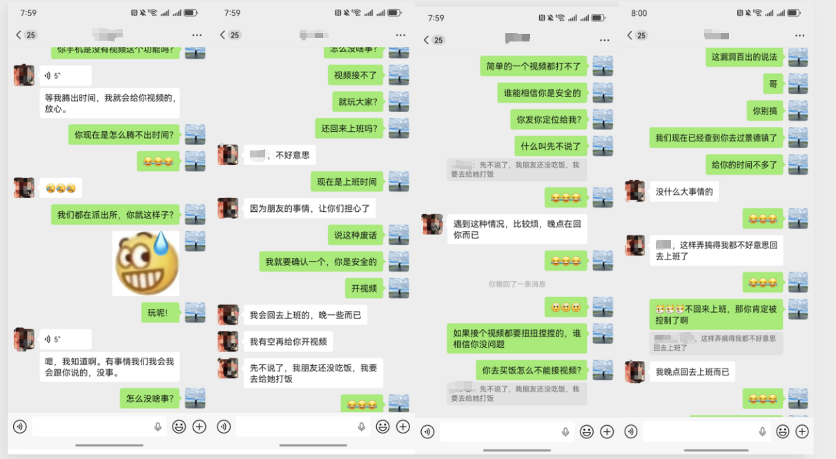 关键时刻,公司行政林小姐通过小李户籍所在地的乡镇街道、村委会,成功联系上其哥哥。小李的家人尝试与他联系,起初语音、视频通话均被拒绝,仅能进行文字沟通。团伙察觉小李公司及家人在持续追问其行踪,遂逼迫他与“女友”拍摄合影,发送给亲友及同事,以此制造正常交往的假象。