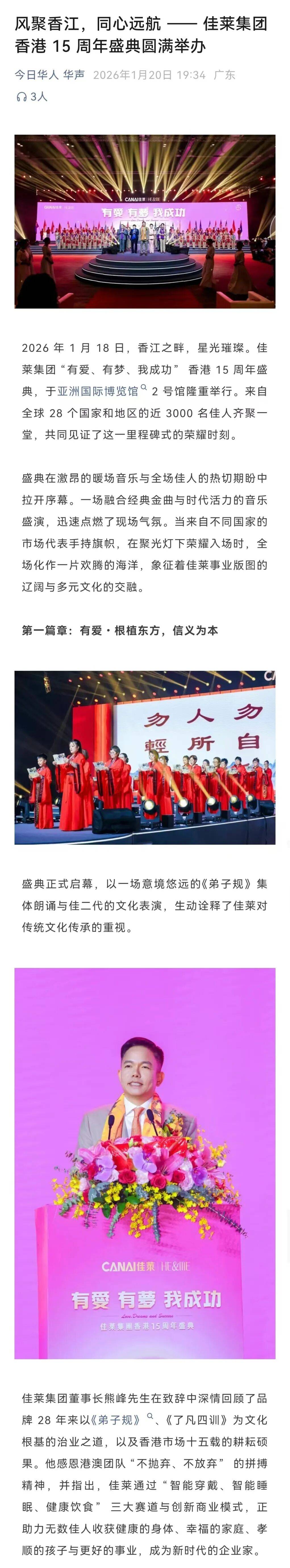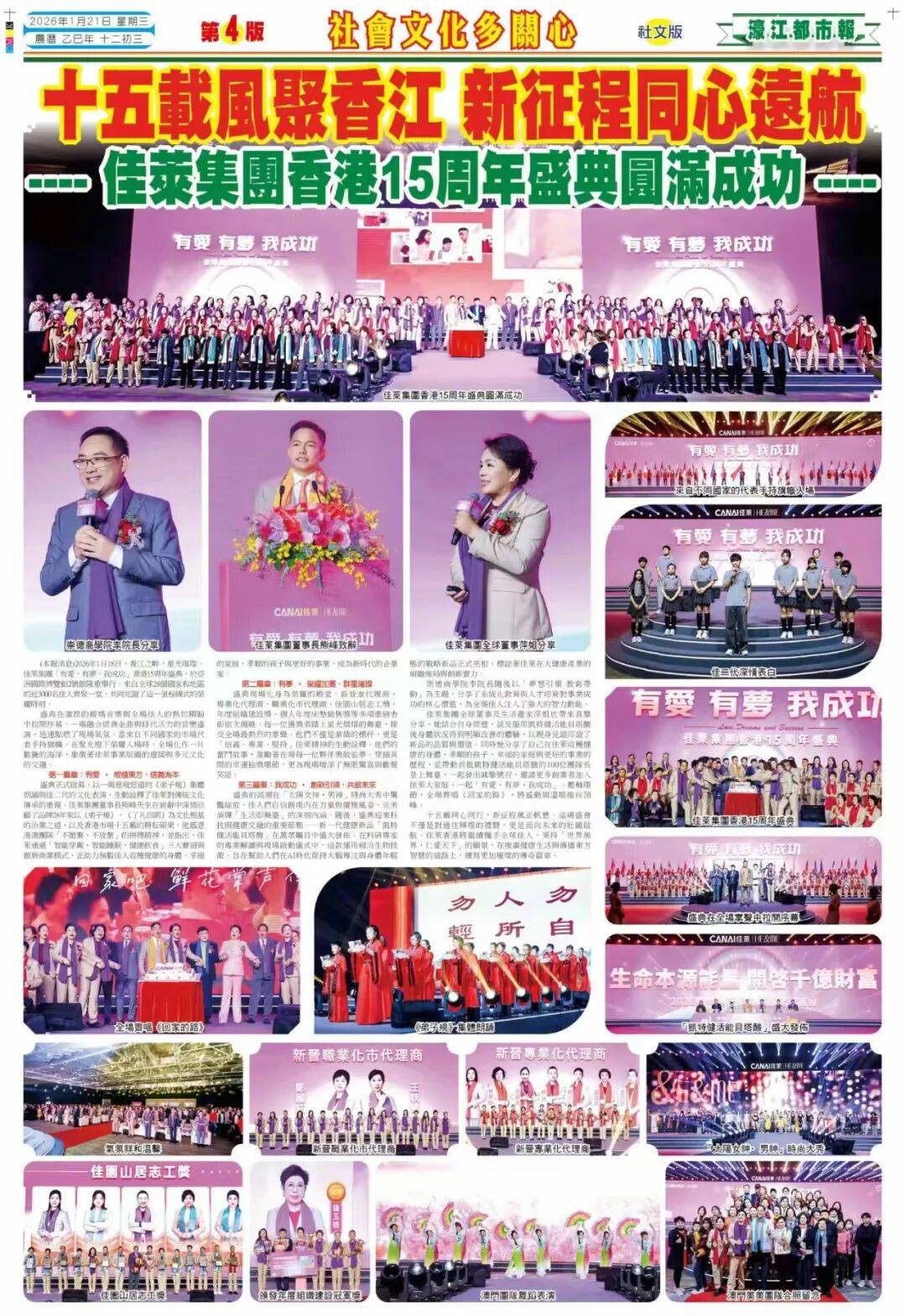 2026年1月18日,香江之畔,星光璀璨。“有爱 有梦 我成功”佳莱集团香港15周年盛典,于亚洲国际博览馆2号馆隆重举行,并获《濠江都市报》整版深度报道、【今日华人 华声】公众号特别展示,见证品牌力量。