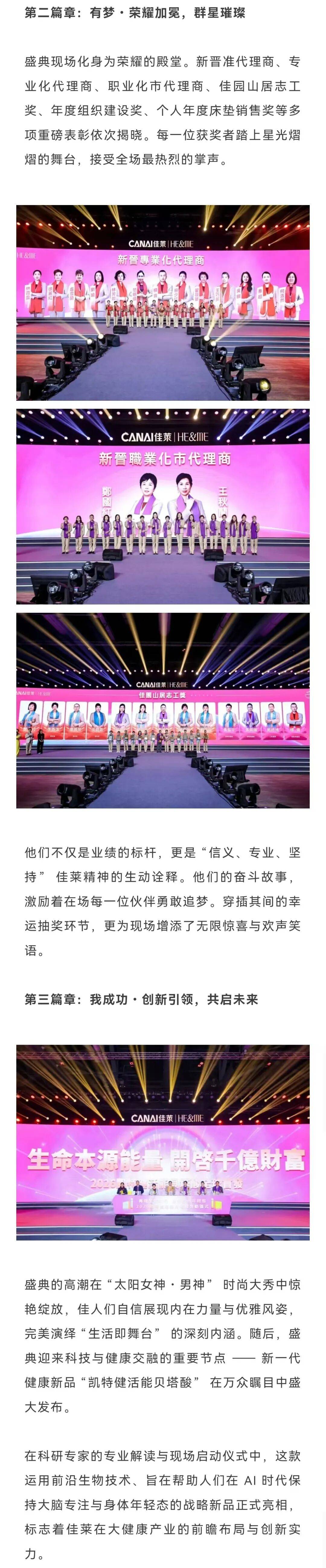 盛典现场化身为荣耀的殿堂。新晋准代理商、专业化代理商、职业化市代理商、佳园山居志工奖、年度组织建设奖、个人年度床垫销售奖等多项重磅表彰依次揭晓。每一位获奖者踏上星光熠熠的舞台,接受全场最热烈的掌声。他们不仅是业绩的标杆,更是「信义、专业、坚持」佳莱精神的生动诠释。他们的奋斗故事,激励着在场每一位伙伴勇敢追梦。穿插其间的幸运抽奖环节,更为现场增添了无限惊喜与欢声笑语。