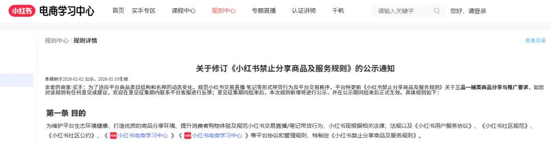 2月2日,小红书对《禁止分享商品及服务规则》进行更新,2月10日起生效,划定“三品一械”禁止分享清单。