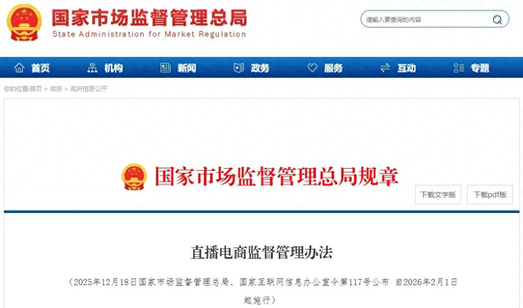除了《直播电商监督管理办法》,由市场监管总局发布的《直播电商经营者落实食品安全主体责任监督管理规定》,将于2026年3月20日正式施行。其中明确划定了13类直播间禁售食品,比如禁止销售营养成分不符合食品安全标准的专供特定人群的食品。同时,该规定还细化了10项直播行为禁令,其中就包括:不得暗示食品具有疾病预防、治疗功能或使用医疗用语;不得对非保健食品声称保健功能;不得混淆普通食品、特殊食品、药品的界限。