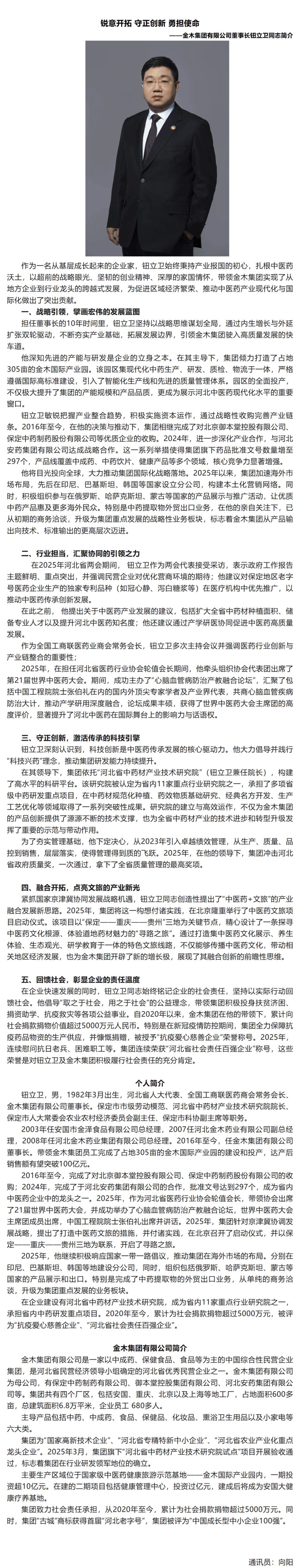 他以赤子之心传国药薪火,以奋进之力拓产业新程。他扎根千年药都,不困于传统、不怯于创新,紧扣健康中国布局,推动中医药产业迭代升级,让古老技艺在现代科技的赋能下焕发新生。他坚守“金品质、共分享”的初心,深耕科研、精益求精,以院士工作站为支撑筑牢产品根基;心系民生、践行使命,躬身公益、传递温暖。他沉稳笃行、远见卓识,以实干扛起企业责任,以坚守传承国药文脉,在大健康赛道上步履铿锵,书写着民营企业家的奋进与担当。