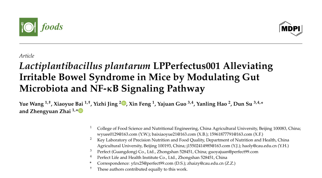 2026 年 1 月 23 日,完美公司自主研发的益生菌植物乳植杆菌 LPPerfectus001(LPP001),其肠易激综合征改善研究成果发表于食品领域国际权威期刊《Foods》。该研究由完美公司联合中国农业大学完成,首次证实 LPP001 可显著改善 IBS 小鼠慢性炎症、内脏高敏感性及肠道屏障损伤,机制为调节肠道菌群和 NF-κB 炎症信号通路。该菌株已获中国发明专利及商标保护,且完成产业化并应用于相关产品。研究遵循 “体外筛选→动物建模→机制解析” 思路,通过多技术手段验证,LPP001 可修复肠道屏障、抑制炎症通路、重塑肠道菌群,缓解腹泻、腹痛等 IBS 症状,为相关人群提供安全有效的益生菌干预新选择,也彰显了完美的自主科研实力。