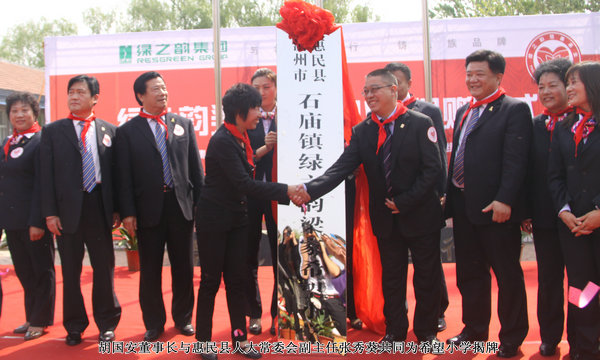 山东省青少年基金会副秘书长王太丽接受捐赠,并对绿之韵集团对社会的人文关怀表示肯定。惠民县人大常委会副主任张秀奎与绿之韵集团胡国安董事长共同为希望小学揭牌,并向胡国安董事长颁发了惠民县荣誉市民证书。