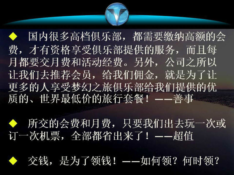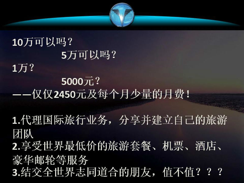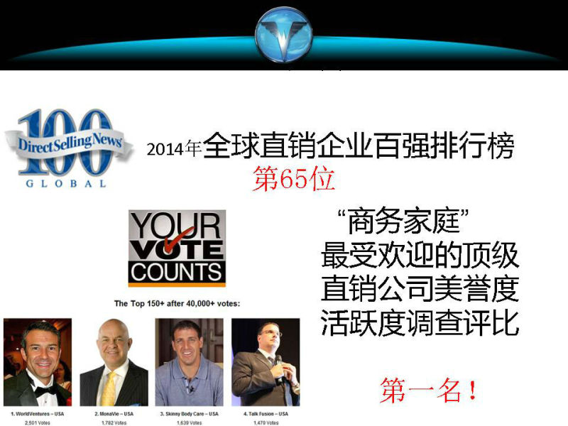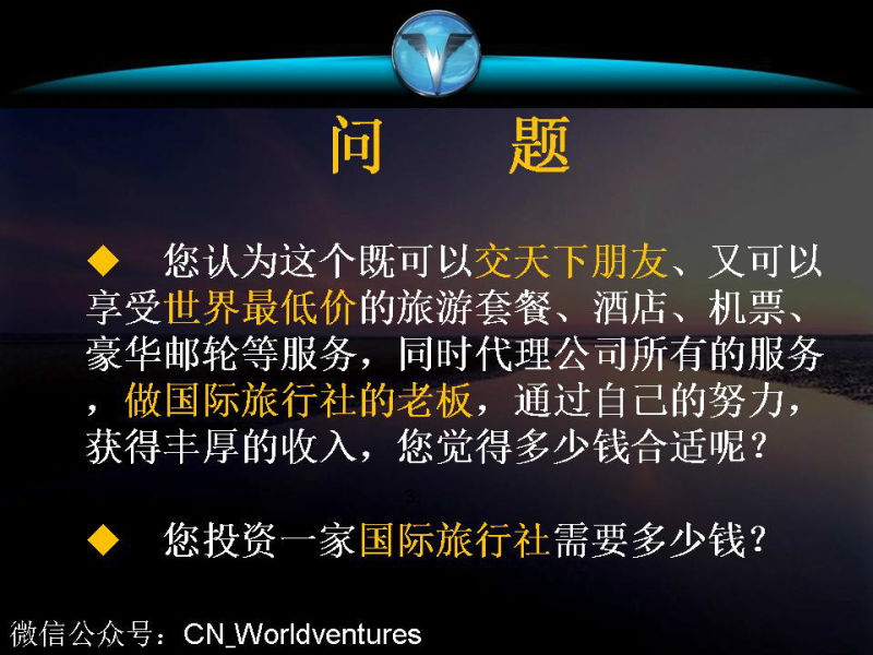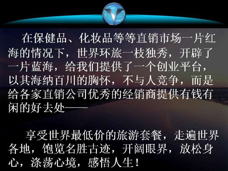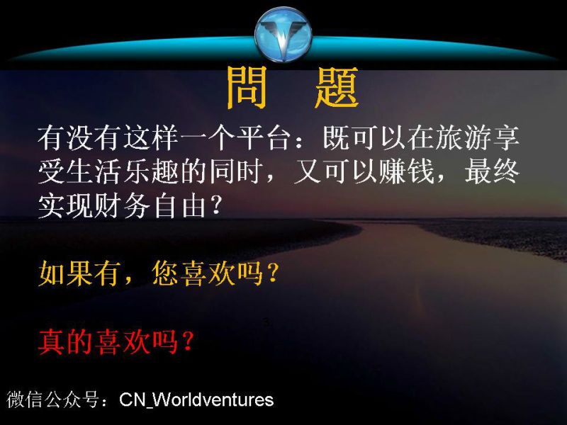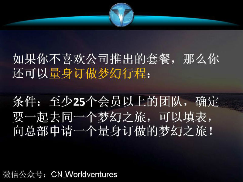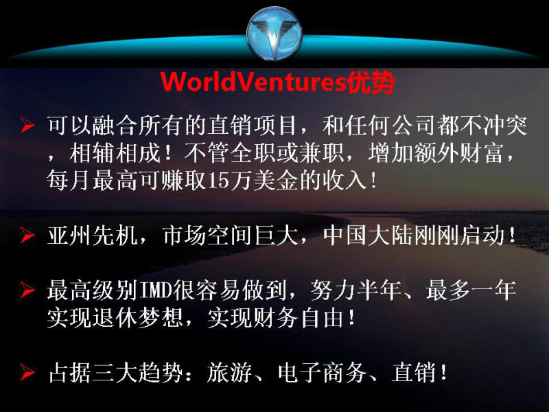 wv梦幻之旅,刚刚进入中国市场的新项目,与十几年前的安利,保险等其他直销一样面临重大机遇!你错过安利,保险等直销行业的早班车,还想错过wv的早班车吗?! 希望你也加入先知先觉的行列!