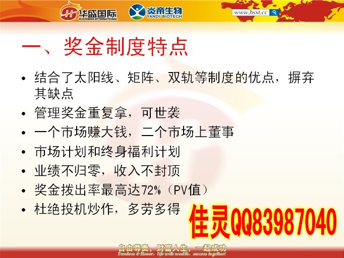 炎帝生物第一品牌华盛国际团队超级领导人佳灵老师QQ83987040 团队提供全国各市场资源共享,讲师团全国各地支持。